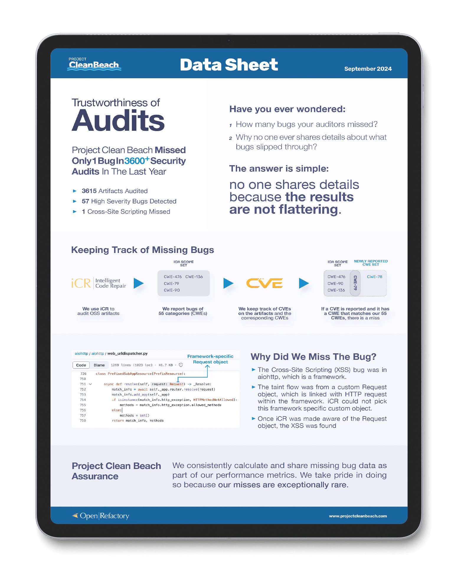 Project Clean Beach redefines industry standards by delivering unmatched accuracy in auditing open-source software, with only one missed bug out of over 3,600 security audits last year. While most organizations shy away from revealing their shortcomings, Project Clean Beach embraces transparency, showcasing rare misses to build trust and improve processes. This data sheet highlights how innovative tools and a commitment to excellence make Project Clean Beach a leader in reliable and trustworthy security audits.